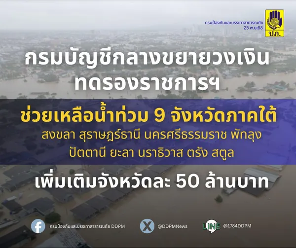 "ขณะนี้กรมบัญชีกลางได้อนุมัติขยายวงเงินทดรองราชการในอำนาจผู้ว่าราชการจังหวัด 9 จังหวัดภาคใต้ ได้แก่ จังหวัดสงขลา สุราษฎร์ธานี นครศรีธรรมราช พัทลุง ปัตตานี ยะลา นราธิวาส ตรัง และจังหวัดสตูล เพิ่มเติมจังหวัดละ 50 ล้านบาท เพื่อใช้ในการแก้ไขปัญหาความเดือดร้อนเฉพาะหน้าและสามารถให้ความช่วยเหลือผู้ประสบอุทกภัยที่ครอบคลุมและทั่วถึงในทุกมิติ ไม่ว่าจะเป็นด้านการดำรงชีพ ด้านการเกษตร ด้านบรรเทาสาธารณภัย และด้านการปฏิบัติงานให้ความช่วยเหลือผู้ประสบภัย