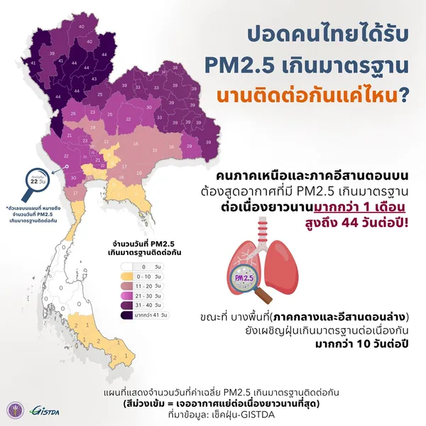 คนภาคเหนือและภาคตะวันออกเฉียงเหนือตอนบน ต้องสูดอากาศที่เป็น PM 2.5 เกินมาตรฐาน และยาวนานมากกว่า 1 เดือนต่อเนื่อง สูงสุดกว่า 44 วัน