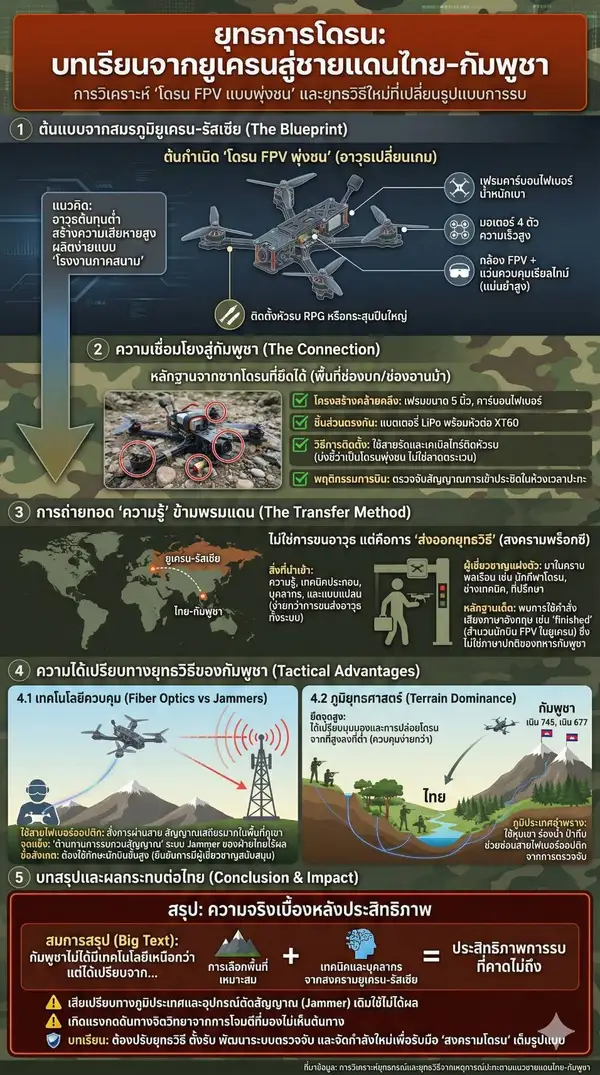 โดยระบุว่า การพัฒนาสงครามสมัยใหม่ทำให้โดรนกลายเป็นอาวุธที่เปลี่ยนรูปแบบการรบอย่างสิ้นเชิง โดยเฉพาะ " โดรน FPV แบบพุ่งชน " ที่ใช้ในสงครามยูเครน–รัสเซีย ซึ่งเป็นต้นแบบสำคัญที่หลายประเทศนำไปประยุกต์ใช้ รวมถึงกัมพูชาในเหตุปะทะตามแนวชายแดนไทยในช่วงที่ผ่านมา การวิเคราะห์รูปแบบโครงสร้าง อุปกรณ์ และภูมิยุทธศาสตร์จากซากโดรนที่ยึดได้ในพื้นที่ไทย ทำให้เห็นความเชื่อมโยงของแนวคิดทางยุทธวิธี และสาเหตุที่กัมพูชาสามารถใช้โดรนได้ แม้ไม่มีประวัติการฝึกมาก่อนอย่างชัดเจน