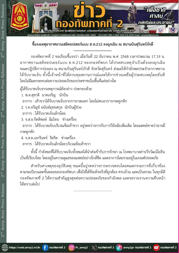 กองทัพภาคที่ 2 ชี้แจงว่า เมื่อวันที่ 22 ธันวาคม พ.ศ. 2568 เวลาประมาณ 17.19 น. อากาศยานเฮลิคอปเตอร์แบบ ฮ.ท.212 ของกองทัพบก ได้ประสบเหตุจำเป็นต้องลงฉุกเฉิน ขณะปฏิบัติการร่อนลง ณ สนามบินสุรินทร์ภักดี จังหวัดสุรินทร์ ส่งผลให้กำลังพลประจำอากาศยาน ได้รับบาดเจ็บ