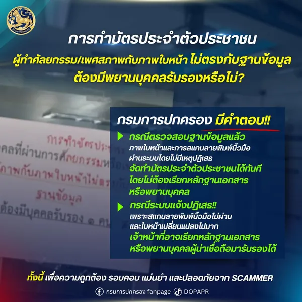 กรมการปกครอง เปิดเผยข้อมูลการทำบัตรประจำตัวประชาชน กรณีผู้ทำศัลยกรรมหรือเพศสภาพกับภาพใบหน้าไม่ตรงกับฐานข้อมูล จำเป็นต้องมีพยานบุคคลรับรองหรือไม่