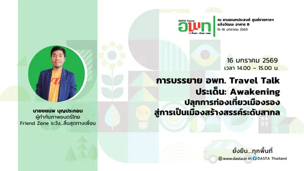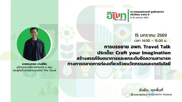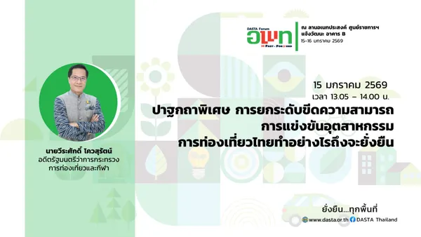 องค์การบริหารการพัฒนาพื้นที่พิเศษเพื่อการท่องเที่ยวอย่างยั่งยืน (องค์การมหาชน) หรือ อพท. เตรียมจัดงาน “DASTA Forum : อพท. Fast Forward” ภายใต้แนวความคิด “ยั่งยืน…ทุกพื้นที่” ระหว่างวันที่ 15-16 มกราคม ณ ลานอเนกประสงค์ ศูนย์ราชการเฉลิมพระเกียรติฯ แจ้งวัฒนะ อาคาร B มุ่งเน้นการยกระดับขีดความสามารถทางการแข่งขันของการท่องเที่ยวไทยผ่านนวัตกรรมและการมีส่วนร่วมของชุมชนอย่างยั่งยืน กิจกรรมในครั้งเป็นเวทีระดับประเทศเพื่อแลกเปลี่ยนองค์ความรู้ด้านการบริหารจัดการการท่องเที่ยวอย่างยั่งยืน และเป็นวาระสำคัญในการเปิดตัวตราสัญลักษณ์ใหม่ของ อพท. ซึ่งสะท้อนถึงการปรับตัวสู่ยุคดิจิทัลและการขับเคลื่อนภารกิจเชิงรุกเพื่อสร้างความมั่งคั่งทางเศรษฐกิจให้กระจายตัวสู่ท้องถิ่นอย่างทั่วถึง