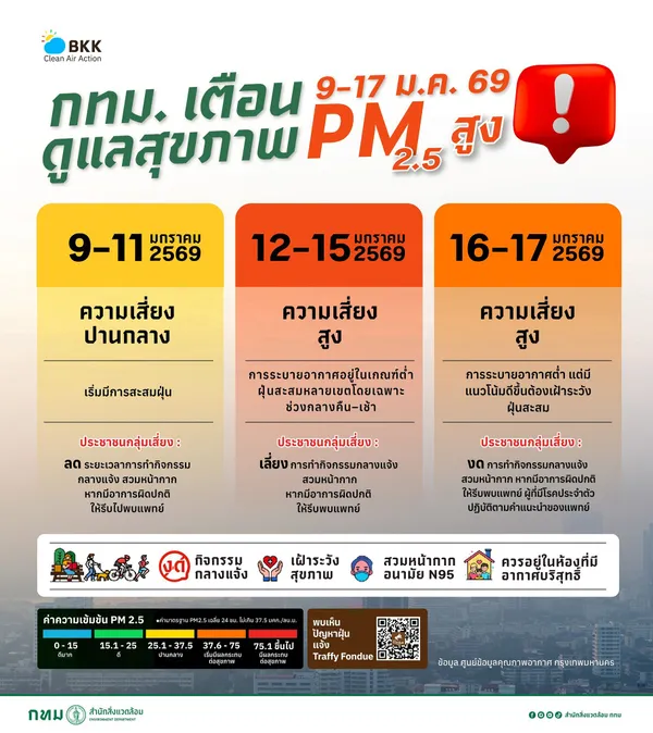 กรุงเทพมหานคร แจ้งเตือน 9–17 ม.ค.69 แนวโน้มฝุ่นสูง