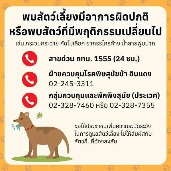กลุ่มควบคุมโรคพิษสุนัขบ้า สำนักงานสัตวแพทย์สาธารณสุข กรุงเทพมหานคร ประกาศเตือน โปรดเฝ้าระวังเนื่องจากพบสัตว์ป่วยด้วยโรคพิษสุนัขบ้า แขวงคลองสามประเวศ เขตลาดกระบัง กรุงเทพมหานคร ประชาชนที่อยู่บริเวณดังกล่าวและชุมชนโดยรอบในรัศมี 5 กิโลเมตร