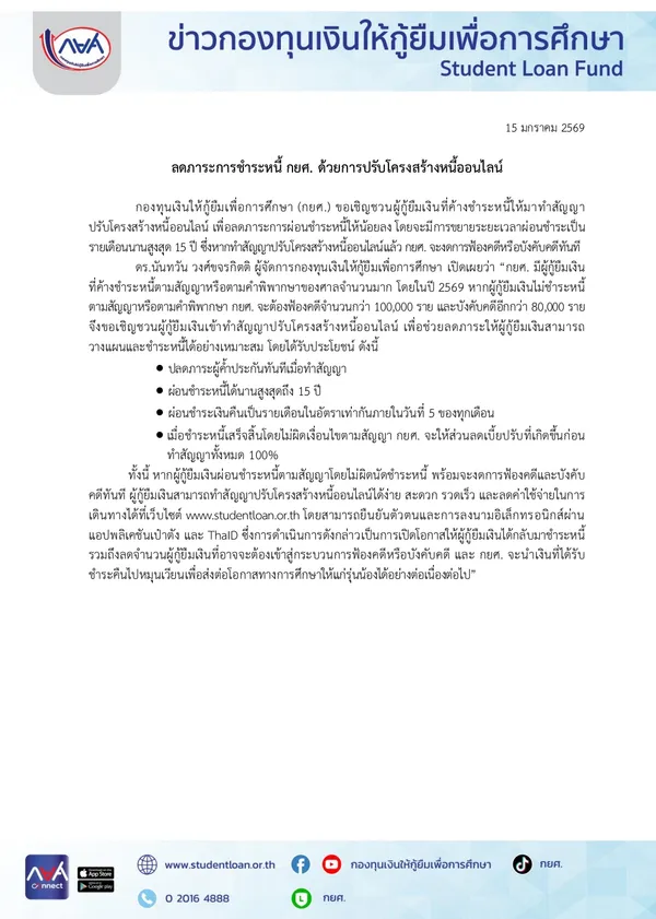 ดร.นันทวัน วงศ์ขจรกิตติ ผู้จัดการกองทุนเงินให้กู้ยืมเพื่อการศึกษา เปิดเผยว่า “กยศ. มีผู้กู้ยืมเงิน ที่ค้างชำระหนี้ตามสัญญาหรือตามคำพิพากษาของศาลจำนวนมาก โดยในปี 2569 หากผู้กู้ยืมเงินไม่ชำระหนี้ตามสัญญาหรือตามคำพิพากษา กยศ. จะต้องฟ้องคดีจำนวนกว่า 100,000 ราย และบังคับคดีอีกกว่า 80,000 ราย จึงขอเชิญชวนผู้กู้ยืมเงินเข้าทำสัญญาปรับโครงสร้างหนี้ออนไลน์ เพื่อช่วยลดภาระให้ผู้กู้ยืมเงินสามารถวางแผนและชำระหนี้ได้อย่างเหมาะสม โดยได้รับประโยชน์ ดังนี้