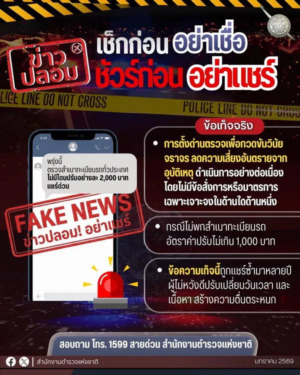 ข่าวปลอม ตำรวจตั้งด่านตรวจสำเนาทะเบียนรถ ใครไม่มีปรับ 2,000 บาท