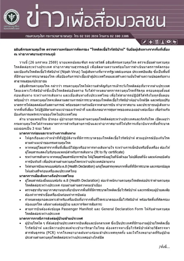 นายแพทย์มณเฑียร คณาสวัสดิ์ อธิบดีกรมควบคุมโรค ตรวจเยี่ยมด่านควบคุมโรคติดต่อระหว่างประเทศ ท่าอากาศยานสุวรรณภูมิ เพื่อติดตามความพร้อมในการดำเนินมาตรการคัดกรองและป้องกันโรคติดเชื้อไวรัสนิปาห์ (Nipah Virus) ในผู้เดินทางที่มาจากรัฐเวสต์เบงกอล ประเทศอินเดีย ซึ่งเป็นพื้นที่ที่มีรายงานการระบาดของโรค เพื่อป้องกันการนำเชื้อเข้าสู่ประเทศไทยและสร้างความมั่นใจด้านความปลอดภัยทางสาธารณสุขแก่ประชาชน