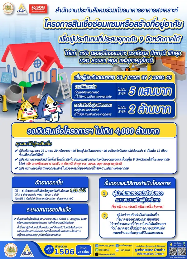 สำนักงานประกันสังคม เดินหน้าช่วยเหลือผู้ประกันตนที่ได้รับผลกระทบจากอุทกภัยในพื้นที่ภาคใต้ โดยจัดทำ “โครงการสินเชื่อซ่อมแซมหรือสร้างที่อยู่อาศัยเพื่อผู้ประกันตนที่ประสบอุทกภัย 9 จังหวัดภาคใต้” ครอบคลุมจังหวัดตรัง นครศรีธรรมราช นราธิวาส ปัตตานี พัทลุง ยะลา สงขลา สตูล และสุราษฎร์ธานี เพื่อบรรเทาความเดือดร้อนและสนับสนุนให้ผู้ประกันตนสามารถฟื้นฟูที่อยู่อาศัยและกลับมาดำรงชีวิตได้ตามปกติ