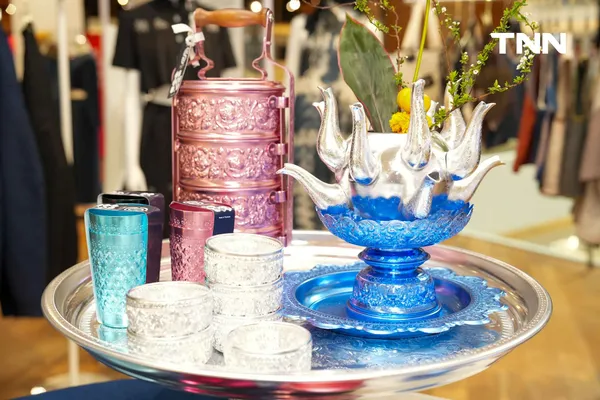 นอกจากนี้นิทรรศการ “ICONCRAFT X PATTERN.ERS CHOKE-LARB POP UP EXHIBITION” ยังร่วมด้วยแบรนด์ “SUCHAI CRAFT” ผู้รังสรรค์ภาชนะอลูมิเนียมลายไทยมานานกว่า 50 ปี ที่พลิกโฉมให้เข้ากับยุคสมัยด้วยการเพิ่มสีสันให้หลากหลาย พร้อมนำเสนอการใช้งานในรูปแบบใหม่ ๆ เปลี่ยนภาพจำของผลิตภัณฑ์อลูมิเนียมลายไทย ให้เป็นของที่ใคร ๆ ก็หยิบมาใช้ได้อย่างร่วมสมัย โดยนำเสนอผลงานชุด “เลิศ ลาภ” ที่หยิบเอาสีสันอันเป็นจุดเด่นของแบรนด์มาเล่าผ่านเรื่องราวของสีมงคล โดย ธนัชชา และ สาริศา ตั้งสุขสว่างพร สองทายาทแบรนด์ SUCHAI CRAFT เล่าถึงคอลเลกชันพิเศษนี้ว่า “แนวคิดของงานครั้งนี้ พูดถึงเรื่องโชคลาภ และเนื่องจาก SUCHAI CRAFT เราโดดเด่นเรื่องสีสัน เลยอยากเอาเรื่องสีมานำเสนอเป็นสีมงคล ซึ่งเรามองว่าเรื่องสีเป็นเรื่องปัจเจก และเราสามาถสร้างความเลิศลาภของเราเองได้ ประกอบกับภาชนะอลูมินียมสีสันของเราสามารถใส่อาหารได้ เราจึงนึกถึงสีโทนสีฟ้า-น้ำเงิน ที่มักจะถูกมองว่านำมาใช้กับอาหารแล้วดูไม่น่ากิน เลยอยากนำโทนสีนี้มาผสมผสานกับนิลกาฬและเงิน นำเสนอเป็นสินค้าตกแต่งโต๊ะอาหาร อย่างถาด ชาม ขัน หรือเหยือก ที่สามารถจัดแต่งทำให้โต๊ะอาหารสวยงามหรูหราขึ้นได้ เพื่อสื่อว่า เราสามารถสร้างสีแห่งโชคลาภได้เอง ขอเพียงเป็นสีที่เรามั่นใจ และใช้ให้ถูกกาลเทศะ ก็จะเป็นสีที่แสดงความเป็น ‘เลิศ’ ซึ่งนำพาเราไปสู่ ‘ลาภ’ ได้นั่นเอง”