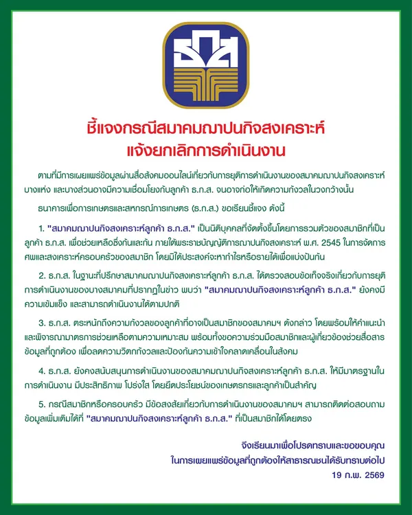 ธ.ก.ส. ชี้แจงกรณีสมาคมฌาปนกิจสงเคราะห์ แจ้งยกเลิกการดำเนินงาน