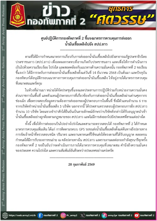 กองทัพภาคที่ 2 ขอเรียนชี้แจงว่า ได้มีการระงับการส่งออกน้ำมันเชื้อเพลิงตั้งแต่วันที่ 14 ธันวาคม 2568 เป็นต้นมา และปัจจุบันกองทัพบกได้อนุมัติกรอบแนวทางการควบคุมการส่งออกน้ำมันเชื้อเพลิง ให้อยู่ภายใต้มาตรการควบคุมที่เหมาะสมและรัดกุมหว่างประเทศอย่างเคร่งครัด