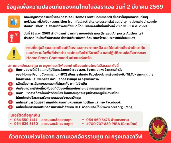 สถานเอกอัครราชทูต ณ กรุงเทลอาวีฟ ออกประกาศข้อมูลสถานการณ์ล่าสุด เตือนคนไทยในอิสราเอล หลังกองบัญชาการส่วนหน้าของอิสราเอล (Home Front Command) มีคำสั่งยกระดับมาตรการความปลอดภัย โดยสั่งยุติกิจกรรมที่ไม่จำเป็นทั้งหมด รวมถึงปิดสถานศึกษาและสถานที่ทำงานทั่วประเทศ โดยมีผลบังคับใช้จนถึงวันนี้ นอกจากนี้ สำนักงานท่าอากาศยานของอิสราเอลยังคงระงับการให้บริการเที่ยวบินพลเรือนจนกว่าจะมีประกาศเปลี่ยนแปลง