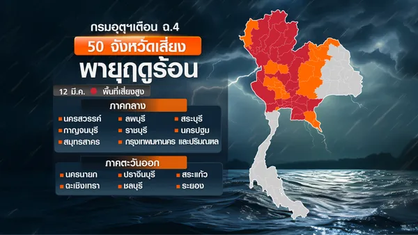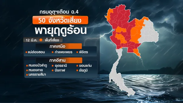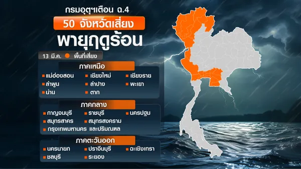 กรมอุตุนิยมวิทยา ประกาศเตือนพายุฤดูร้อน ฉบับที่ 4 ซึ่งเป็นฉบับล่าสุดของวันนี้(12 มี.ค.) ซึ่งพายุฤดูร้อนจะส่งผลกระทบในพื้นที่เสี่ยงใน 50 จังหวัดในภาคเหนือ ภาคกลาง รวมทั้งกรุงเทพมหานครและปริมณฑล ด้านตะวันตกของภาคอีสาน และภาคตะวันออก