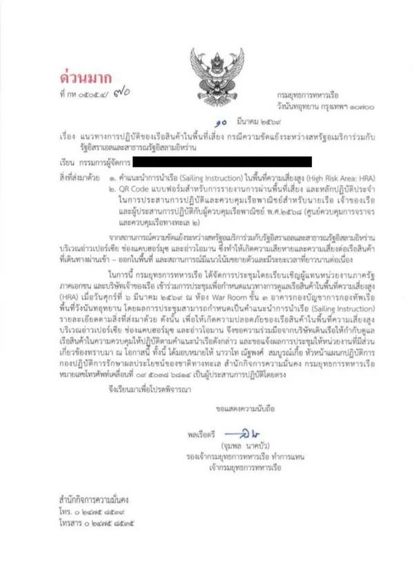 กรมยุทธการทหารเรือเผยแพร่คำแนะนำการนำเรืออย่างเป็นทางการ พร้อมจัดทำ QR Code สำหรับให้เรือและบริษัทเดินเรือรายงานข้อมูลตำแหน่งและสถานการณ์