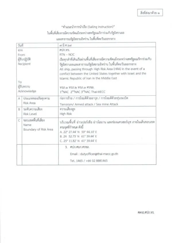 กรมยุทธการทหารเรือออกหนังสือแจ้งเตือนครั้งที่ 1 ถึงสมาคมเจ้าของเรือไทยและบริษัทเจ้าของเรือ โดยแจ้งให้รับทราบถึงสถานการณ์ความตึงเครียดระหว่างสหรัฐอเมริกาและอิหร่านที่ยังอยู่ในระดับสูง พร้อมแนะนำให้ผู้ประกอบการติดตามสถานการณ์อย่างใกล้ชิด และพิจารณาดำเนินมาตรการด้านความปลอดภัยในการเดินเรือ