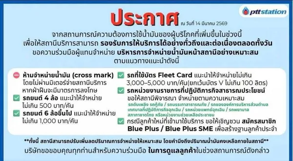 ประกาศดังกล่าวลงวันที่ 14 มีนาคม 2569 โดยระบุแนวทางการบริหารการจำหน่ายน้ำมันในสถานีบริการ เพื่อให้เกิดการกระจายการให้บริการอย่างเหมาะสม โดยแนะนำให้สถานีบริการพิจารณาจำกัดปริมาณการจำหน่ายตามประเภทของรถ
