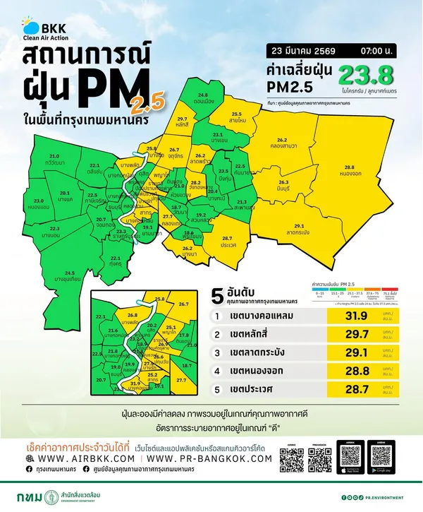 ศูนย์ข้อมูลคุณภาพอากาศกรุงเทพมหานคร รายงานสถานการณ์ฝุ่นละอองขนาดไม่เกิน 2.5 ไมครอน (PM 2.5) ในกรุงเทพมหานคร ประจำวันที่ 23 มีนาคม 2569 เวลา 07:00 น.