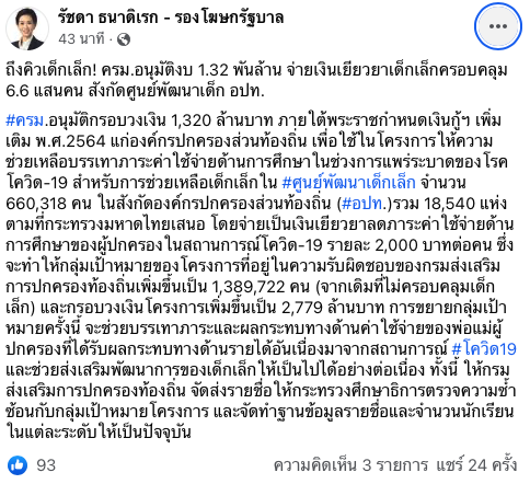 การขยายกลุ่มเป้าหมายครั้งนี้จะช่วยบรรเทาภาระและผลกระทบทางด้านค่าใช้จ่ายของพ่อแม่ผู้ปกครองที่ได้รับผลกระทบทางด้านรายได้อันเนื่องมาจากสถานการณ์โควิด-19 และช่วยส่งเสริมพัฒนาการของเด็กเล็กให้เป็นไปได้อย่างต่อเนื่อง ทั้งนี้ ให้กรมส่งเสริมการปกครองท้องถิ่น จัดส่งรายชื่อให้กระทรวงศึกษาธิการตรวจความซ้ำซ้อนกับกลุ่มเป้าหมายโครงการ และจัดทำฐานข้อมูลรายชื่อและจำนวนนักเรียนในแต่ละระดับให้เป็นปัจจุบัน