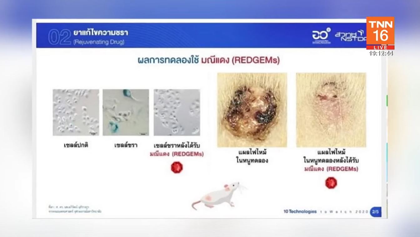 วันนี้ (19 ต.ค.64) ศ.นพ.อภิวัฒน์ มุทิรางกูร อาจารย์ประจำคณะแพทยศาสตร์ จุฬาลงกรณ์มหาวิทยาลัย หัวหน้าทีมวิจัย สำนักงานพัฒนาวิทยาศาสตร์และเทคโนโลยีแห่งชาติ หรือ สวทช. เปิดเผยความสำเร็จในการต่อยอดยาต้านความชรา จากโมเลกุล “มณีแดง”