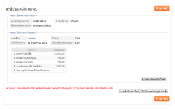6.1.4.ตรวจสอบข้อมูลรายละเอียดการนำส่งเงินสมทบให้ถูกต้องและคลิก ดำเนินการต่อ ระบบจะแสดงหน้าจอยืนยันการบันทึกข้อมูลพร้อมทั้งส่ง E-Mail แจ้งรับข้อมูลเงินสมทบ