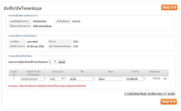 6.1.2.ระบุจำนวนผู้ประกันตนที่นำส่งเงินสมทบแล้วคลิก ตกลง ระบบจะเพิ่มจำนวนรายชื่อที่ต้องกรอกข้อมูลให้
