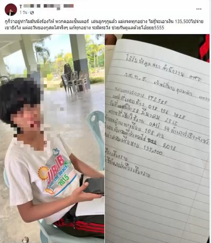 วันนี้ ( 9 พ.ย. 65 )ผู้สื่อข่าวรายงานว่า จากกรณีที่มีสมาชิก Facebook คนหนึ่งได้โพสต์ข้อความว่า “ก็อยู่ว่าทำไมมานั่งร้องไห้ พวกคอลเซ็นเตอร์เล่นลูกๆ แล้ว จดทุกอย่าง ไม่รู้จะเอาเงิน 135,500 บาท ไปจ่ายเขายังไง ในแต่ละวันสดใสจริงๆ แก้ทุกอย่าง ระมัดระวังช่วยกันดูแลด้วยโอ้ยยยย 555” ซึ่งปรากฏว่า มีผู้เข้ามาแสดงความคิดเห็นจำนวนมาก เพื่อเป็นการตรวจสอบเรื่องนี้ ผู้สื่อข่าวจึงได้เดินทางไปที่โรงเรียนมัธยมแห่งหนึ่งในเขต อ.ขุขันธ์ จ.ศรีสะเกษ ได้พบกับนายธวัชชัย หาญกิจจารักษ์ หรือครูด๊อก ซึ่งเป็นครูสอนพิเศษวิชาดนตรีและน้องออย (นามสมมุติ) อายุ 13 ปี น.ร.ชั้น ม.1 ที่โดนแก๊งคอลเซ็นเตอร์โทรมาข่มขู่หลอกลวง
