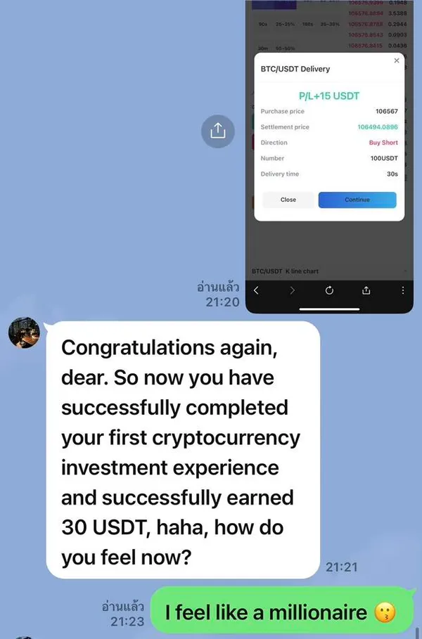 เขาโอนเงินให้เธอทดลองเทรด 200 ดอลลาร์สหรัฐ (ราว 7,482 บาท) ซึ่งสามารถถอนออกมาได้จริง และต่อมาเธอก็ทำกำไรเพิ่มอีก 12,518 บาท รวมแล้วได้เงินจากมิจฉาชีพรายนี้ เกือบ 20,000 บาท