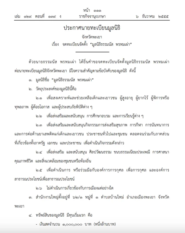 ชื่อมูลนิธิ: มูลนิธิธรรมนัส พรหมเผ่า
