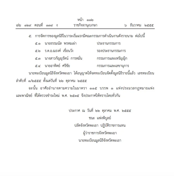 วันที่จดทะเบียน: 22 ตุลาคม พ.ศ. 2555 (ตามเอกสารราชกิจจานุเบกษา เล่ม 129 ตอนที่ 116 ง วันที่ 6 ธันวาคม 2555)