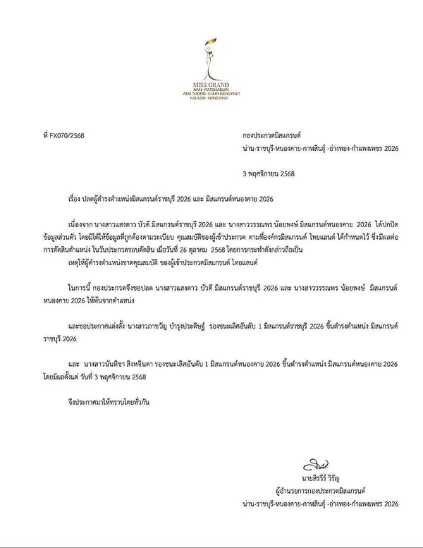 วงการนางงามเกิดความสั่นสะเทือนครั้งใหญ่ หลังกองประกวดมิสแกรนด์ราชบุรี 2026 ออกประกาศปลด "นับดาว แสงดาว บัวดี" ผู้คว้ามงกุฎไปเมื่อสัปดาห์ที่ผ่านมา (27 ตุลาคม 2568) ออกจากตำแหน่งอย่างเป็นทางการ เมื่อวันที่ 3 พฤศจิกายน 2568 โดยระบุถึงสาเหตุหลักว่ามาจากการ**"ปกปิดข้อมูลส่วนตัว ซึ่งขัดต่อคุณสมบัติของผู้เข้าประกวด"** ตามระเบียบข้อบังคับขององค์กร เหตุการณ์นี้เกิดขึ้นพร้อมกับการปลดมิสแกรนด์หนองคาย 2026 ในวันเดียวกัน และ ทำให้ชื่อของเธอกลายเป็นที่สนใจและถูกค้นหาอย่างมากในฐานะผู้เข้าประกวดที่มีเส้นทางนางงามที่พลิกผันอย่างรวดเร็ว
