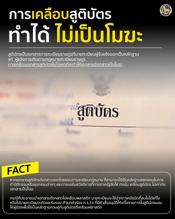 กลายเป็นประเด็นแชร์ว่อนเน็ตที่สร้างความตื่นตระหนกให้กับพ่อแม่ผู้ปกครอง กรณีข่าวลือที่ว่า "ห้ามเคลือบพลาสติกสูติบัตรเด็ดขาด หากเคลือบแล้วจะถือเป็นโมฆะและใช้การไม่ได้" ล่าสุด กรมการปกครองได้ออกมาให้คำชี้แจงอย่างเป็นทางการ เพื่อสร้างความเข้าใจที่ถูกต้องให้แก่ประชาชน
