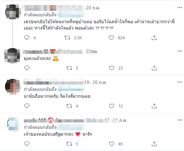 ทั้งนี้ หลังจากโพสต์ดังกล่าวได้ถูกเผยแพร่ออกไป ก็มีชาวเน็ตเข้ามาคอมเมนต์และทวีตข้อความออกไปอย่างต่อเนื่อง บ้างก็มาแชร์ว่าหอพักที่ตนเองพักอยู่ได้ลดค่าเช่าเหมือนกัน ซึ่งทางเจ้าของโพสต์เองก็ได้บอกอีกว่า "จะขนของที่ได้กลับไปให้คนงานที่หมู่บ้านต่อ ขอรับไว้แต่น้ำใจก็พอ เค้าน่าจะลำบากกว่านี่เยอะ ทางนี้ได้กำลังใจพอแล้ว"