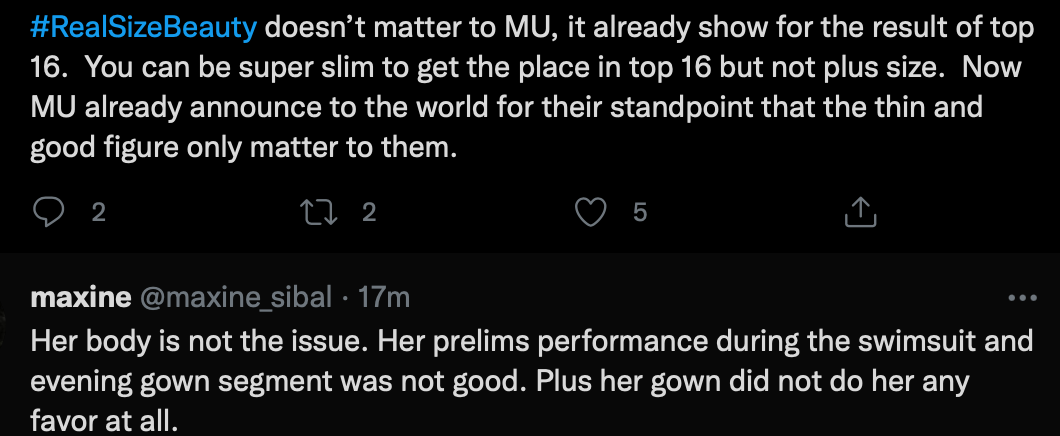 ขณะที่ชาวทวีตต่างเข้ามาสนับสนุนคอมเม้นต์ของ ‘เปีย อลอนโซ่’และรีทวีตออกไปกว่า 2.1 หมื่นครั้งเลยทีเดียวบางรายถึงกับตำหนิเวทีMiss Universe ว่าแสดงจุดยืนอย่างชัดเจนในการคัดเลือกสาวงาม 16 คนสุดท้าย โดยเลือกสาวงามที่ผอมมากเข้ารอบ มันแสดงให้เห็นว่ามาตรฐานของเวทีชื่นชอบในคนผอม คนรูปร่างดีมากกว่า