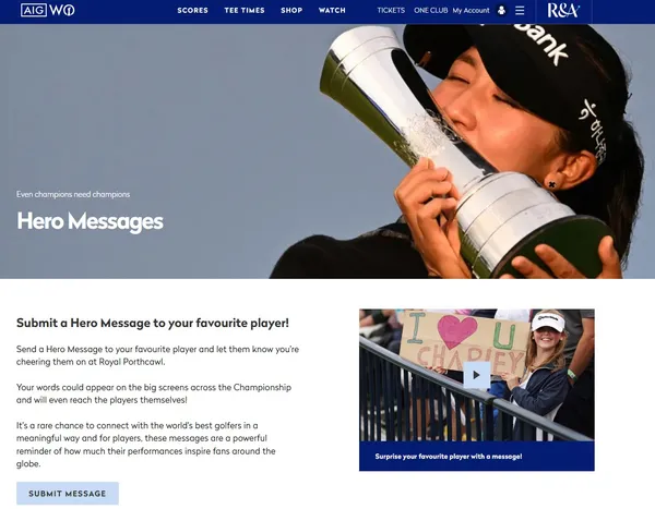 สำหรับแคมเปญ Hero Messages (ฮีโร่ แมสเสจ) เปิดตัวเป็นครั้งแรกในการแข่งขันกอล์ฟรายการ เอไอจี วีเมนส์ โอเพ่น 2025 เพื่อให้แฟนๆ ได้ใกล้ชิดกับนักกอล์ฟในดวงใจมากขึ้น โดยแฟนกีฬาทั่วโลกสามารถอัพโหลดข้อความส่วนตัว ไม่ว่าจะเป็นรูปภาพหรือคลิปวิดีโอ ส่งถึงนักกอล์ฟคนโปรดผ่านเว็บไซต์ www.aigwomensopen.com/herowall โดยข้อความต่างๆ จะปรากฏบนทีวีจอใหญ่ในสนามแข่งขันและบนเว็บไซต์ของรายการ ช่วยให้ผู้เล่นสามารถรับรู้ถึงการสนับสนุนและสร้างความสัมพันธ์เชื่อมโยงกับแฟนกีฬาที่ส่งใจเชียร์จากทั่วโลก