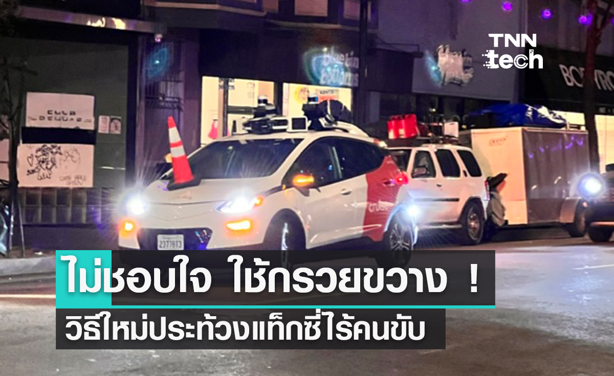 ผู้ประท้วงแท็กซี่ไร้คนขับ ปิ๊งไอเดียเอากรวยจราจรวางบนรถ ขวางระบบไม่ให้ขับต่อ