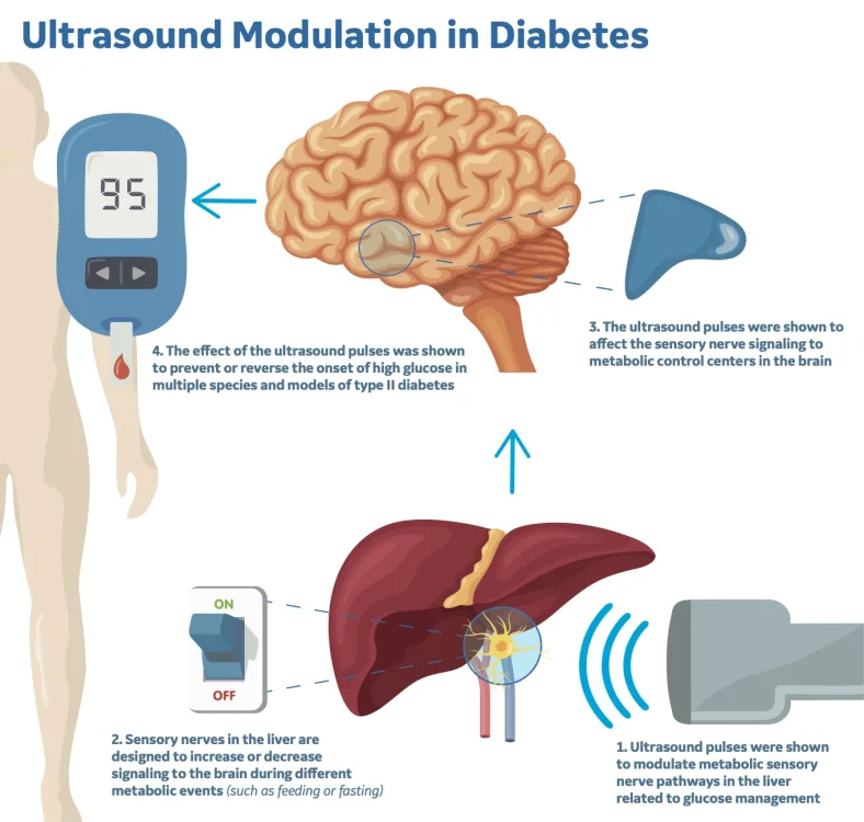 ล่าสุด นักวิทยาศาสตร์จากสถาบันวิจัย GE ได้พัฒนาวิธีการลดระดับน้ำตาลในเลือดโดยใช้คลื่นอัลตราซาวด์กระตุ้นข่ายประสาทเฉพาะภายในตับ เรียกว่า Peripheral Focused Ultrasound Stimulation (pFUS) ส่งผลให้ระดับน้ำตาลในเลือดลดลงอย่างมีประสิทธิภาพ ไร้ผลข้างเคียงเช่นที่เกิดขึ้นจากการใช้ยา