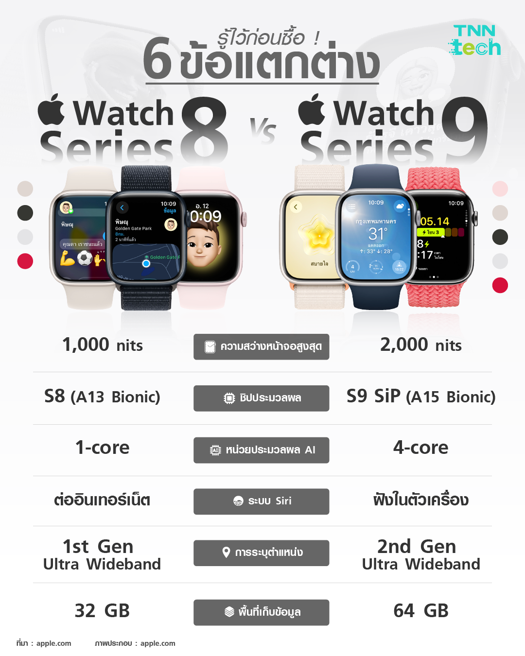หลังจากที่แอปเปิล (Apple) เปิดตัวสินค้าใหม่ในงาน Apple “Wonderlust” Event เมื่อ 13 กันยายน ตามเวลาประเทศไทย หนึ่งในไอเทมใหม่สำหรับสายสุขภาพที่น่าสนใจก็คือ Apple Watch Series 9 สมาร์ตวอชรุ่นใหม่ล่าสุด ซึ่ง TNN Tech ได้รวบรวมความแตกต่างกับ Apple Watch Series 8 สมาร์ตวอชรุ่นก่อนหน้ามาไว้ 6 จุด ด้วยกัน