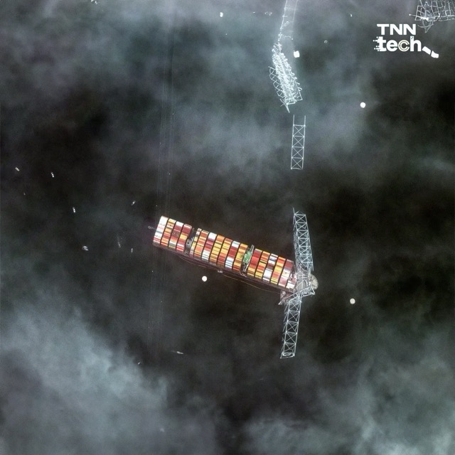 ภาพถ่ายดาวเทียม MAXAR เมื่อเวลาประมาณ 11.36 น. ตามเวลาท้องถิ่น วันที่ 26 มีนาคม 2024 (หลังเกิดเหตุประมาณ 10 ชั่วโมง) แสดงให้เห็นโครงสร้างสะพานที่พังทลาย มีเรือขนส่งอยู่ใต้โครงสร้างสะพาน และมีจุดยานพาหนะเล็ก ๆ อยู่โดยรอบ ซึ่งเป็นยานพาหนะของเจ้าหน้าที่ค้นหา