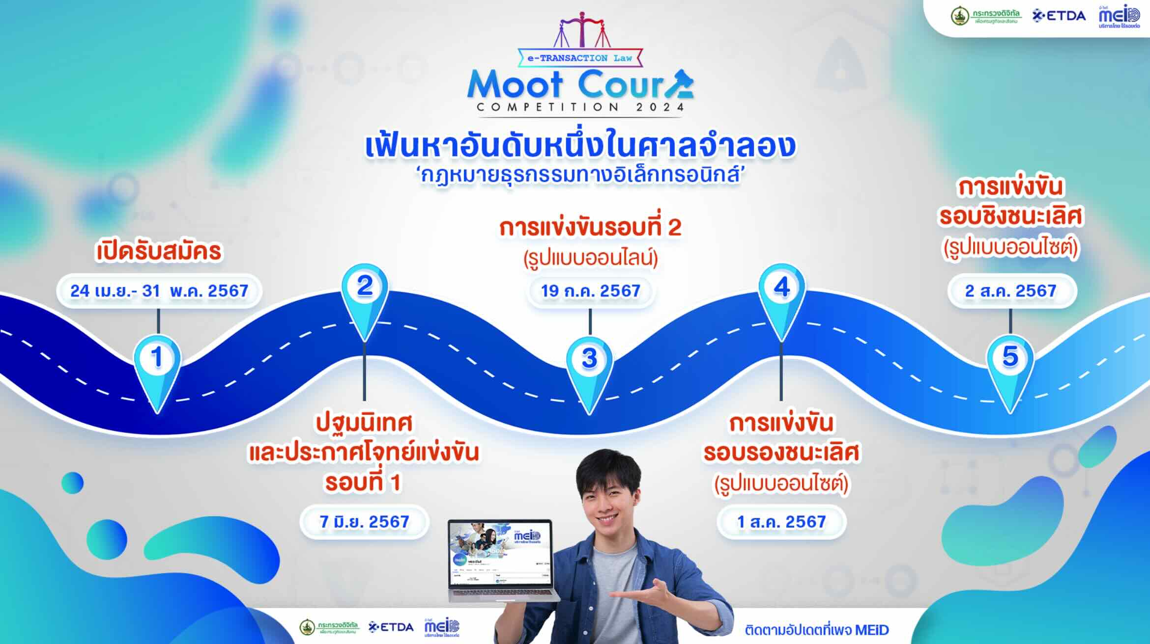 สำนักงานพัฒนาธุรกรรมทางอิเล็กทรอนิกส์ (สพธอ.) หรือเอ็ดด้า (ETDA) จัดกิจกรรม e-TRANSACTION LAW MOOT COURT COMPETITION 2024 สำหรับนิสิต นักศึกษา ระดับปริญญาตรี สายกฎหมาย ไม่จำกัดสถาบันและชั้นปี ร่วมแข่งขันโต้เถียงปัญหา ‘กฎหมายธุรกรรมทางอิเล็กทรอนิกส์’ โดยการแถลงการณ์ด้วยวาจาใน ชั้นอุทธรณ์ ชิงเงินรางวัลมูลค่ารวมกว่า 130,000 บาท พร้อมโอกาสในสายอาชีพนักกฎหมายยุคใหม่ โดยเปิดรับสมัครแล้ว ตั้งวันนี้ - 31 พฤษภาคม