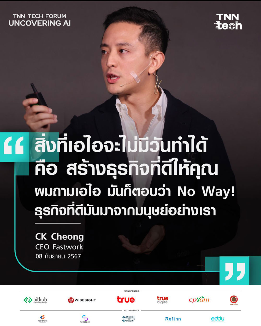 ในงานสัมมนา "Uncovering AI: ปลดล็อก AI กำหนดทิศทางปัญญาประดิษฐ์" จัดโดย TNN Tech เมื่อวันที่ 8 ตุลาคม 2567 คุณ CK Cheong ซีอีโอของ Fastwork ได้เปิดเผยมุมมองเกี่ยวกับบทบาทของ AI ในธุรกิจและชีวิตประจำวัน พร้อมชี้เทรนด์ธุรกิจในยุค AI