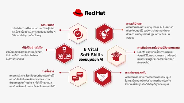 Red Hat ชี้ว่า แม้จะมีเครื่องมือ AI จำนวนมาก แต่เครื่องมือเหล่านั้นมักใช้กับงานเฉพาะทางและบทบาทเฉพาะอย่าง แต่ทักษะด้านมนุษยสัมพันธ์และอารมณ์ (soft skills) กลับเป็นทักษะที่มีความเป็นสากลที่ทุกคนควรให้ความสำคัญกับการพัฒนาและปรับปรุง ไม่ว่าจะอยู่ในตำแหน่งหรือสายงานใดก็ตาม ผ่าน 6 ทักษะ ในมุมมองของ Red Hat ดังนี้