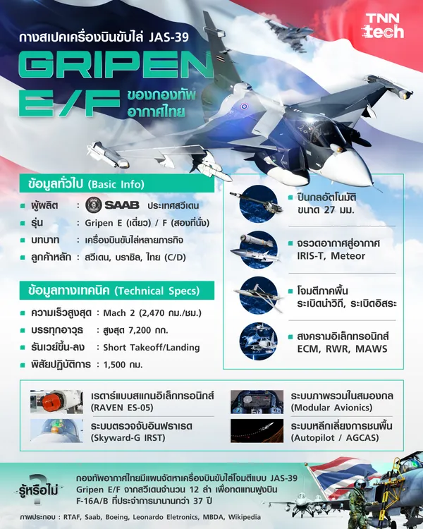 Gripen เป็นเครื่องบินขับไล่อเนกประสงค์สัญชาติสวีเดน ผลิตโดยบริษัท SAAB มีการพัฒนาอย่างต่อเนื่องมาตั้งแต่รุ่น JAS-39A/B, C/D จนถึง E/F ซึ่งเป็นเวอร์ชันล่าสุด โดยรุ่น E เป็นแบบที่นั่งเดียว และรุ่น F เป็นแบบสองที่นั่ง เหมาะสำหรับภารกิจทั้งการฝึกและการรบจริง แม้ในปัจจุบันกองทัพอากาศไทยจะใช้งานรุ่น C/D อยู่ในฝูงบินที่ 701 แต่หากแผนจัดหารุ่น E/F จำนวน 12 ลำได้รับการอนุมัติ ก็จะเป็นการยกระดับขีดความสามารถของฝูงบินอย่างมีนัยสำคัญ