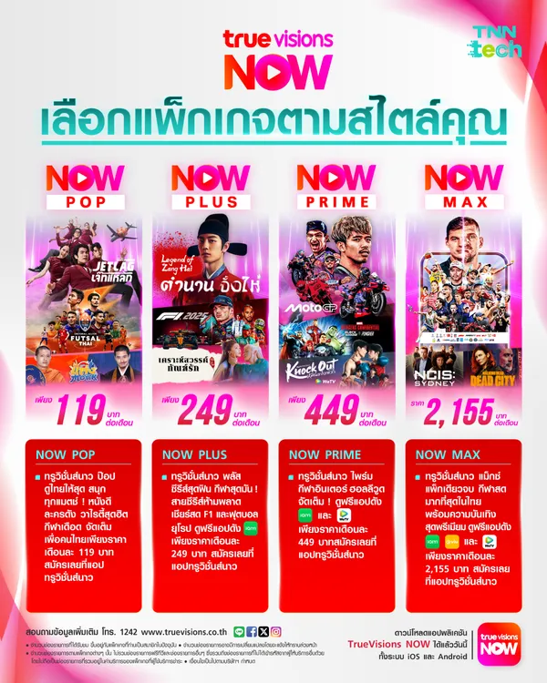 ทรูวิชั่นส์ นาว (TrueVisions NOW) มอบประสบการณ์ความบันเทิงแบบครบจัดเต็ม เพื่อตอบโจทย์ความหลากหลายและสร้างความแตกต่างให้กับผู้ชมยุคใหม่ โดยปัจจุบันมีคอนเทนต์ครอบคลุมทุกหมวดหมู่ ทั้งกีฬา ข่าว ซีรีส์ ภาพยนตร์ วาไรตี้ สารคดี และอนิเมะ จากหลากหลายภูมิภาค ไม่ว่าจะเป็นไทย จีน เกาหลี ญี่ปุ่น อเมริกา หรือยุโรป สมาชิกสามารถเลือกสมัครแพ็กเกจที่ตรงกับความต้องการได้จาก 4 แพ็กเกจที่ทรูวิชั่นส์ นาว คัดสรรมาอย่างเหมาะสมผ่านแอปพลิเคชันเดียวครบจบทุกความบันเทิง