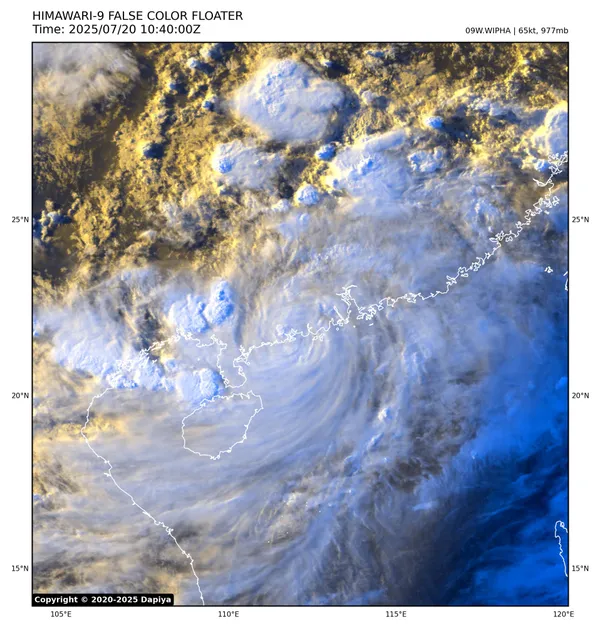 ภาพถ่ายจากดาวเทียมฮิมาวาริของญี่ปุ่น เผยให้เห็นศูนย์กลางพายุโซนร้อน "วิภา" กำลังเคลื่อนตัวอยู่ในอ่าวตังเกี๋ยอย่างชัดเจน โดยกรมอุตุนิยมวิทยาคาดการณ์ว่าพายุลูกนี้จะเคลื่อนขึ้นฝั่งประเทศเวียดนามตอนบนในวันพรุ่งนี้ 22 กรกฎาคม 2568 คาดส่งผลกระทบให้ประเทศไทยมีฝนตกหนักถึงหนักมากในหลายพื้นที่
