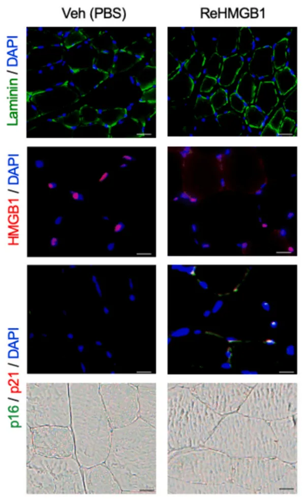 นักวิทยาศาสตร์ได้วิเคราะห์เซลล์มนุษย์ในห้องแล็บและทดลองกับหนู พบว่าเมื่อโปรตีน ReHMGB1 ถูกบล็อกในหนูทดลองที่มีกล้ามเนื้อบาดเจ็บ กล้ามเนื้อฟื้นตัวได้เร็วขึ้น สัญญาณการแก่ชราลดลง การอักเสบทั่วร่างกายเบาบางลง และสมรรถภาพทางกายดีขึ้น