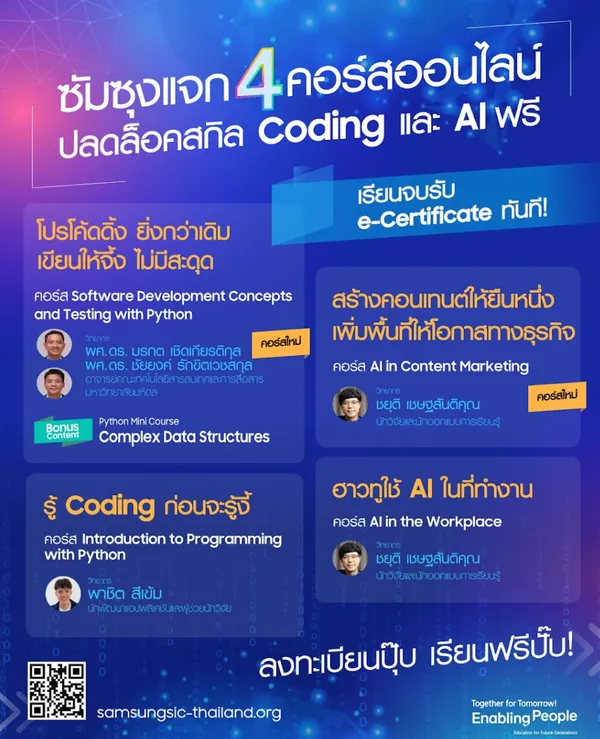 สำหรับความพิเศษในปีนี้ ซัมซุงเดินหน้าขยายขอบเขตการเรียนรู้ จัดสอนเนื้อหาทั้งหมด 4 คอร์สออนไลน์ฟรี โดยเพิ่ม 2 คอร์สใหม่ที่เข้มข้นและทันสมัยยิ่งขึ้น เพื่อตอบโจทย์โลกยุค AI และการเปลี่ยนแปลงอย่างรวดเร็วของทั้งสังคมการเรียนรู้และตลาดแรงงาน ช่วยให้ผู้เรียนสามารถนำเทคโนโลยีไปประยุกต์ใช้ได้จริงในทุกมิติของชีวิต ไม่ว่าจะเป็น การพัฒนาโค้ดขั้นสูง (Advanced Coding), การใช้ AI สร้างคอนเทนต์การตลาด (AI Marketing Content Creation), การวิเคราะห์ข้อมูล (Data Science) และ พื้นฐานการคิดเชิงคำนวณ (Computational Thinking)ออกแบบมาให้ผู้เรียนสามารถเรียนได้ทุกที่ทุกเวลา พร้อมรับประกาศนียบัตรจากซัมซุงเพื่อเพิ่มโอกาสในเส้นทางอาชีพอย่างเป็นรูปธรรม