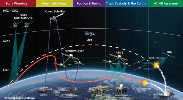 ระบบดาวเทียมจะเริ่มตรวจจับขีปนาวุธความเร็วเหนือเสียงหลังจากที่มันถูกยิงขึ้นสู่ท้องฟ้า และส่งข้อมูลตำแหน่งและความเร็วไปยังระบบป้องกันต่าง ๆ โดยระบบจะทำงานเชื่อมต่อกันเป็นเครือข่ายขนาดใหญ่ทั้งระบบดาวเทียม GPS รวมไปถึง ระบบป้องกันขีปนาวุธชั้นสูง (THAAD) บนพื้นดิน และระบบอาวุธ AEGIS (AWS) บนผิวน้ำ