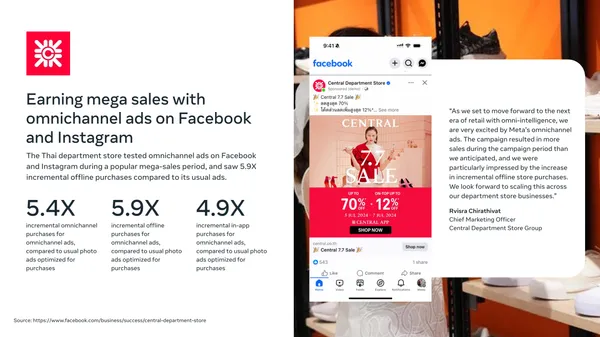 ห้างเซ็นทรัลไม่ได้เป็นเพียงผู้บุกเบิกในการนำ Omnichannel ads มาใช้เท่านั้น แต่ยังเป็นหนึ่งในบริษัทแรก ๆ ของประเทศไทยที่เปิดตัวกลยุทธ์ Omnichannel ads ที่เชื่อมต่อออนไลน์เข้ากับออฟไลน์แบบครบวงจรร่วมกับ Meta อีกด้วย