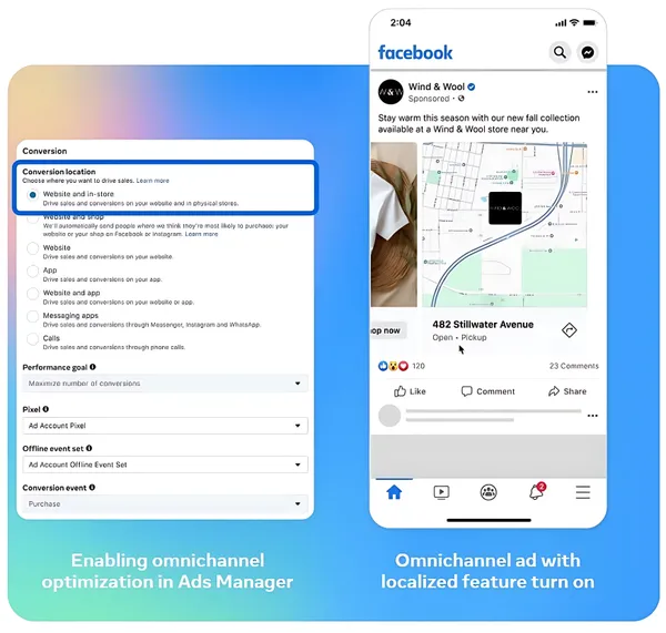 โฆษณา Omnichannel คือโซลูชันหลักสำหรับธุรกิจที่ต้องการขับเคลื่อนยอดขายออนไลน์และออฟไลน์เพิ่มเติม โดยใช้พลังของ AI เพื่อสร้างประสบการณ์การช้อปปิ้งที่ไร้รอยต่อ โดยโฆษณา Omnichannel ของ Meta ได้ใช้แมชชีนเลิร์นนิงจับคู่สินค้ากับลูกค้า และกระตุ้นยอดขายในทุกจุดที่แบรนด์มีปฏิสัมพันธ์กับลูกค้า