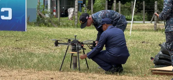 ภาพเจ้าหน้าที่เตรียมสาธิตการติดตั้งพลุควันกับโดรนไฮบริด - TNN Tech